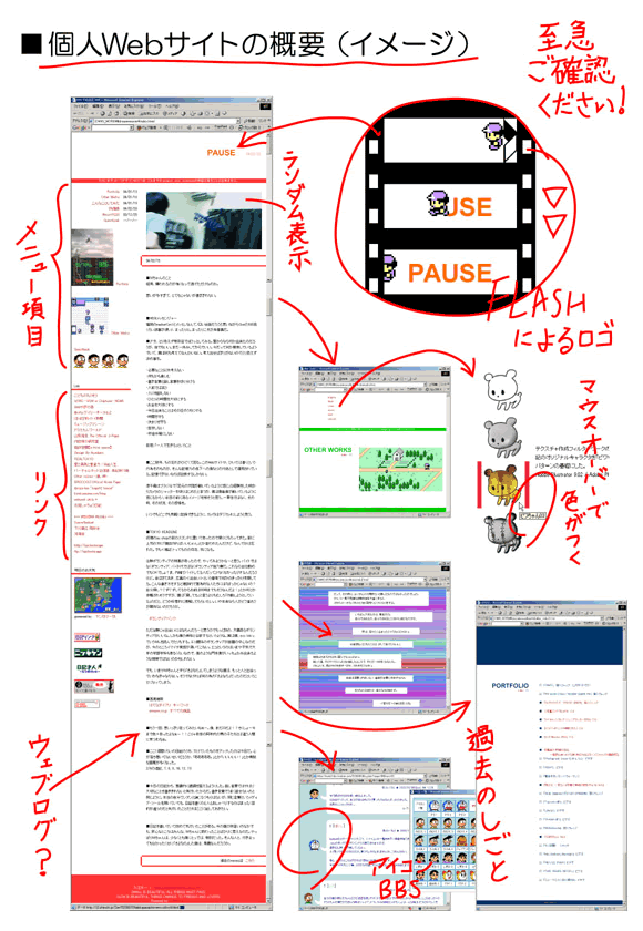 2004年2月にポートフォリオに追加したグラフィック(2)。当Webサイトの概要を説明している。他ページとは異なるレイアウトで、手書き注釈が加えられた書類を模している。 Adobe Illustrator 9.02 / Adobe Photoshop 6.0 |