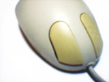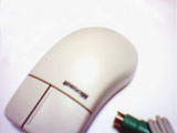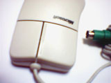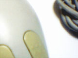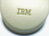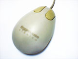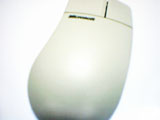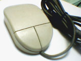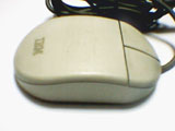 古くなって黄ばんだマウスのどてっぱらに、IBMのロゴが刻まれている。ボディの材質はappleADBmouseのような硬質なプラスチックで、全体の大きさからか外殻が分厚い印象を受ける。クリック音は軽い高音で、右ボタンはさらに半音高いといったところだ。この音が、見た目の鈍重さに比して小気味よい使用感をアピールすのに一役かっている。実際のところ重量もそれほどなく、中身が空洞であるような安価なグリップ感は否めないが、形状や表面加工は丹精で、見た目と使用感のアンバランスさに往年のコンピューター・デザインの匂いを残している。そういった点が現在におけるこのマウスの味わいとなっているのだ。 |